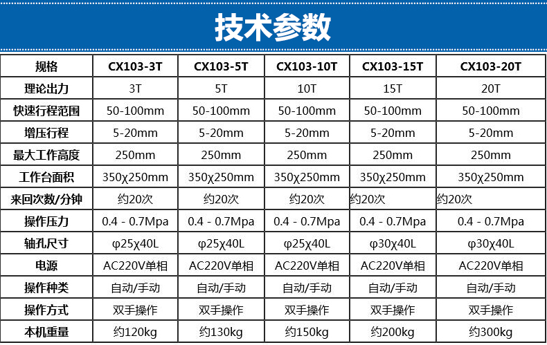 科鑫盟CX103系列四柱增压机,又叫四柱增压冲床,四柱增压压床,利用空油压增压原理,达到动作速度快,高出力的要求; 4、出力调整容易,只要调整气压压力,就能达到需要的压力,简单又方便