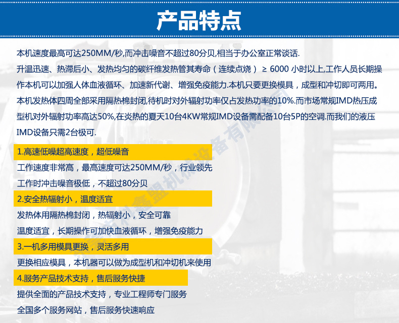 科鑫盟CX109F热压成型机采用四柱三板式开放空间,四柱配合精密缝性导套,针对IMD行业(模内装饰镶嵌注塑技术)和薄膜、PET、PVC等片材成型而研发的专业设备,采用远红外线辐射的方式均匀加热片材,再经过恒温装置,油缸压力使之瞬间成型。本机只要更换模具,成型和冲切即可两用。